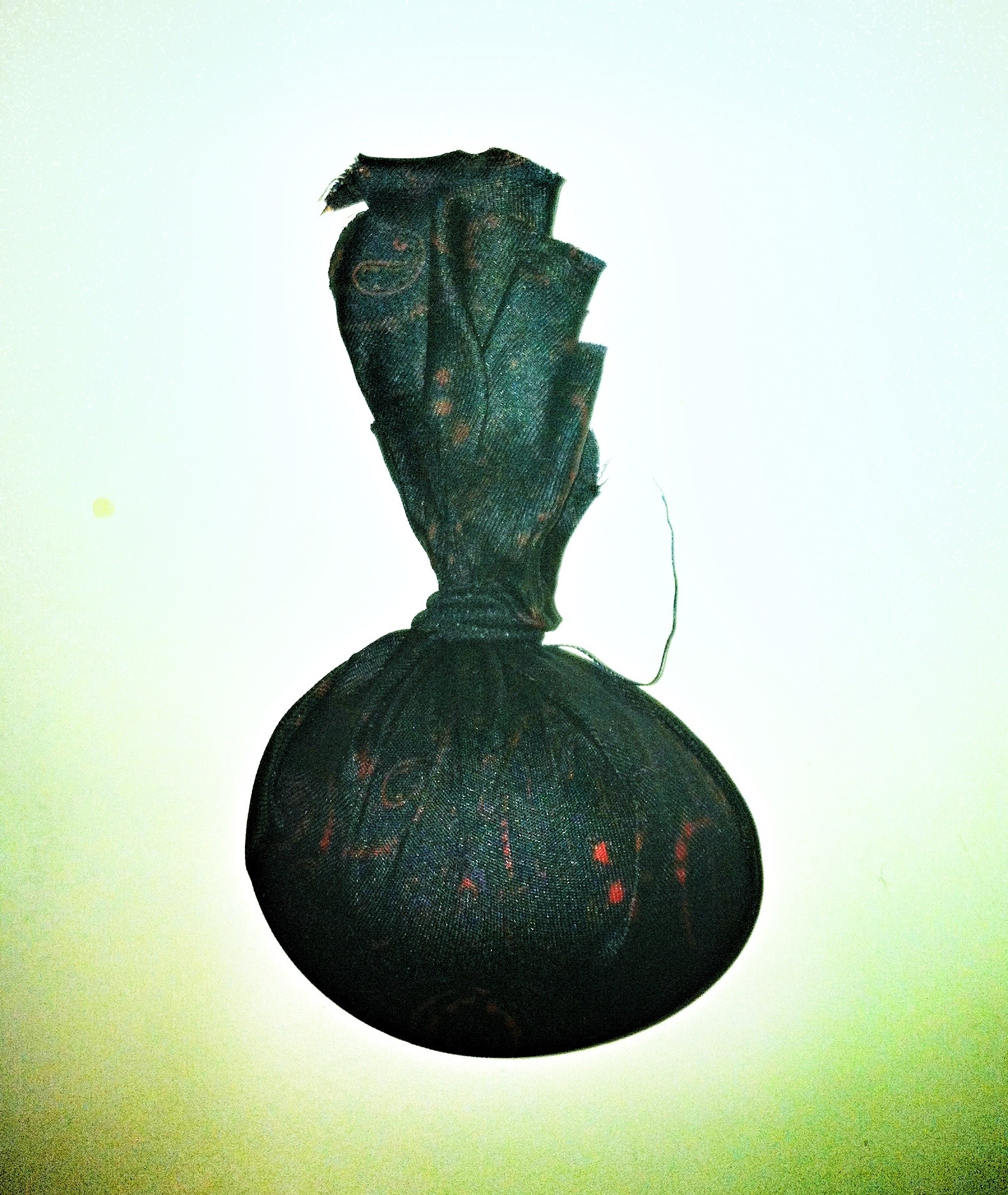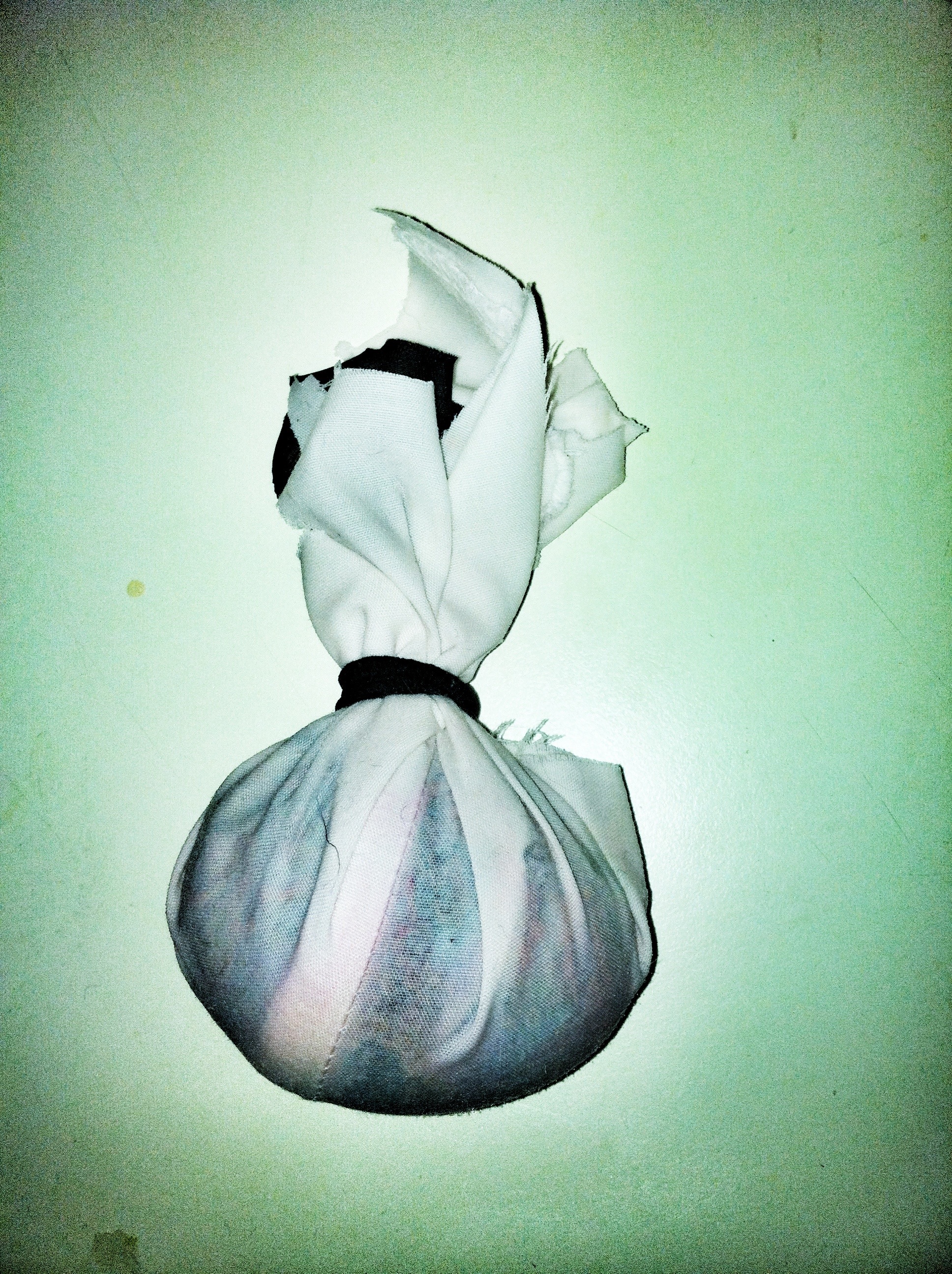 Next, take a pillow case or a cotton shirt or sheet or anything white and light and cut a piece that will wrap the egg again. This catches some of the die and stops one egg from staining another. Tie it off in the same place and your egg will look like this (except dry because I already submerged this one):
