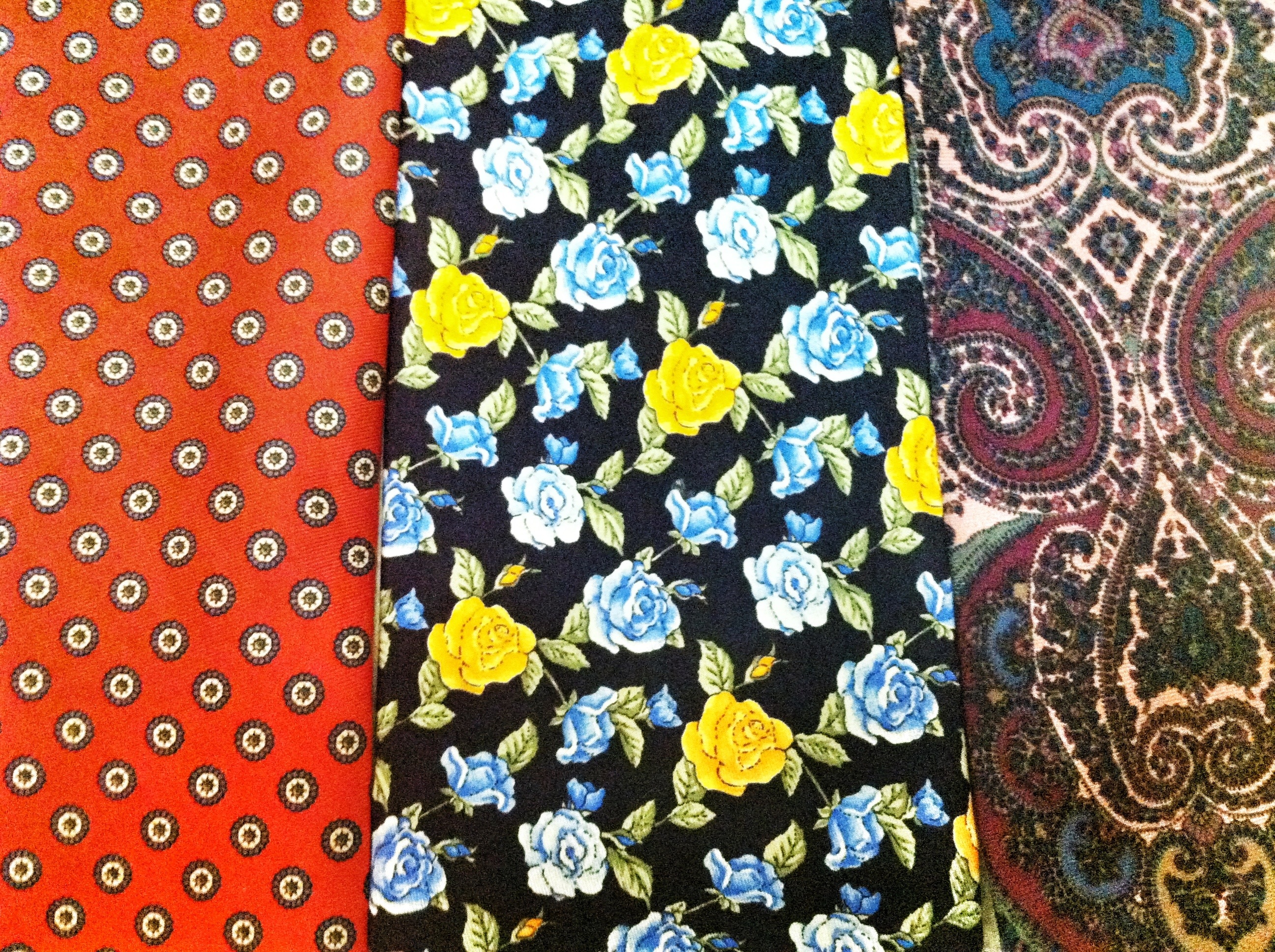 Once your eggs are hollow and ready to go, pick your tie! The tie MUST be 100% silk. This is usually marked on the tie somewhere, either on the back strip or in the tag that is usually tucked in to the small end of the tie. A great place to find ties is at Goodwill, or any other thrift store. Find the ugliest ties you can. As a general rule, if it’s a disaster of a tie for a man, its gunna be a gorgeous egg. Ties with bold deep color work best, light colors and especially green (for some odd reason) do not transfer easily. The egg wont be as deeply colored as the tie, so the more color there is on the tie, the darker your egg will be.