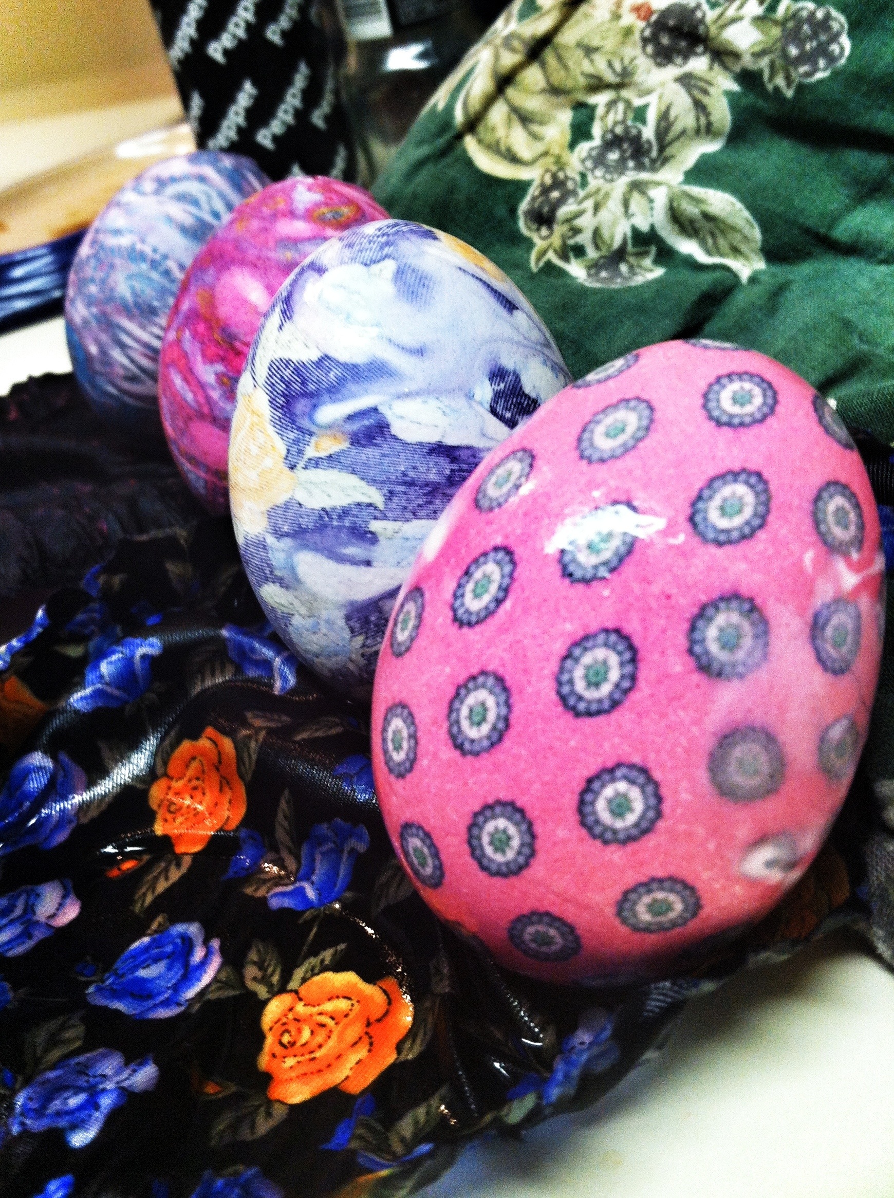 Easter is just days away and today has been dedicated to the new tradition Polar Bear and I started last year. I found this idea on Pinterest, and the directions here are super easy to follow http://www.ourbestbites.com/2012/03/silk-dyed-eggs-aka-tie-dyed/ but I’m gunna summarize the directions here for you too!