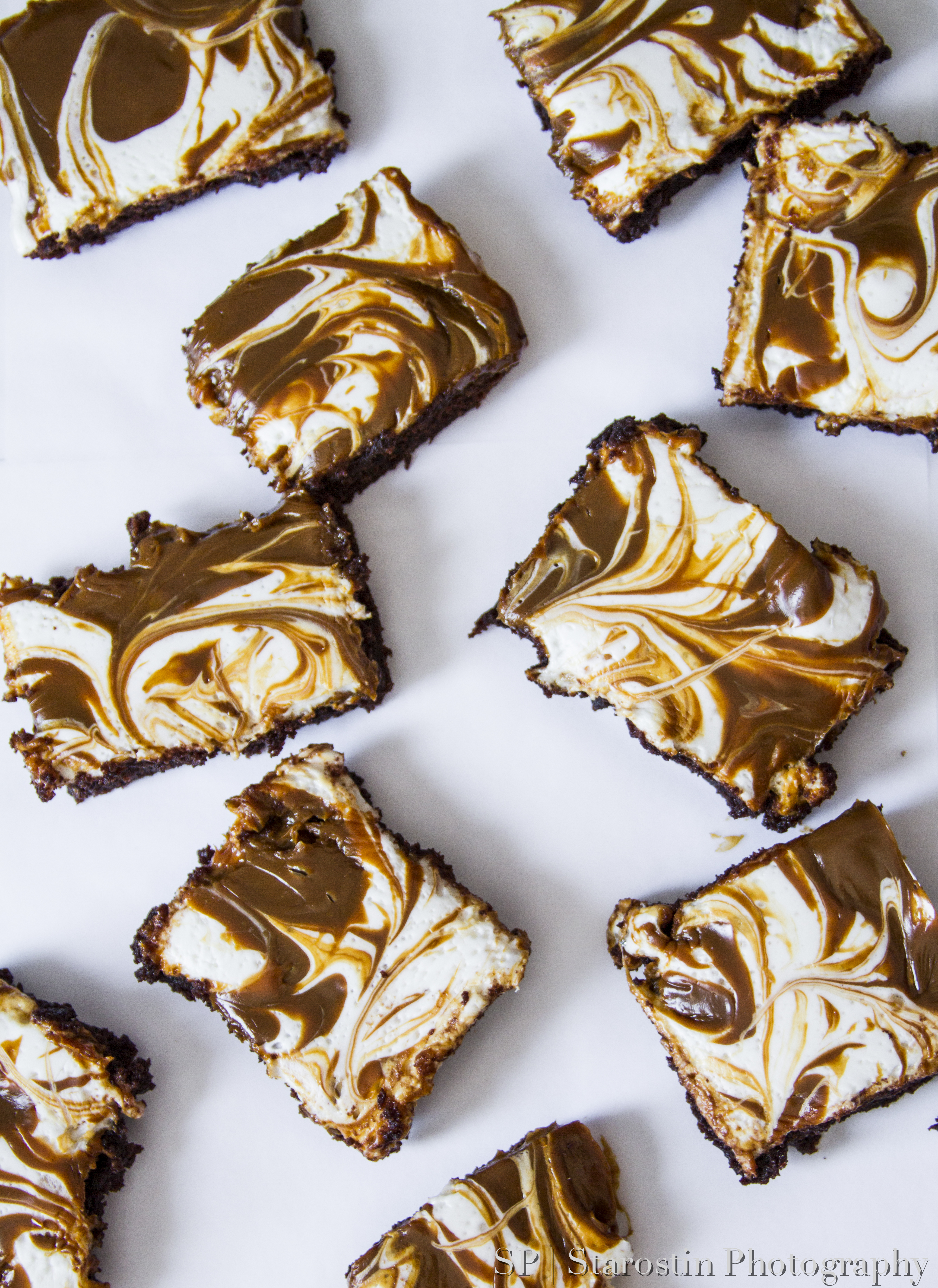 2.) Prep brownie mix as directed on box and pour into prepared and lined pan. Drop spoonfuls of marshmallow fluff around the brownies (Don’t worry about full coverage as you’ll fill in the empty spots with the Dulce de Leche)