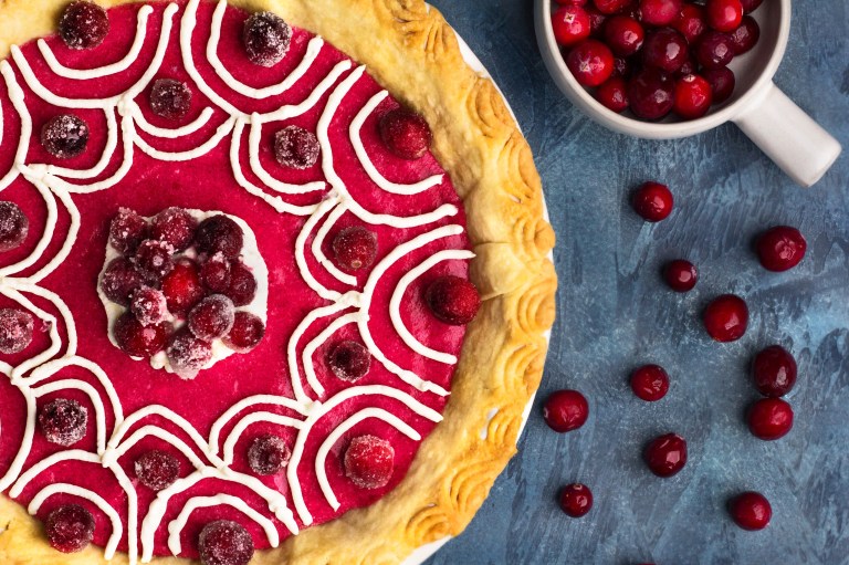 - Spread ⅓ cup sugar on a plate. Boil remaining ½ cup sugar with ½ cup water in a 2-qt. saucepan until sugar is dissolved, about 2 minutes. Remove from heat and stir in remaining cranberries. Using a slotted spoon, transfer cranberries to plate; roll in sugar and scatter over top of pie. Whip cream in a bowl until stiff peaks form; using a spoon, dollop cream in center of pie.