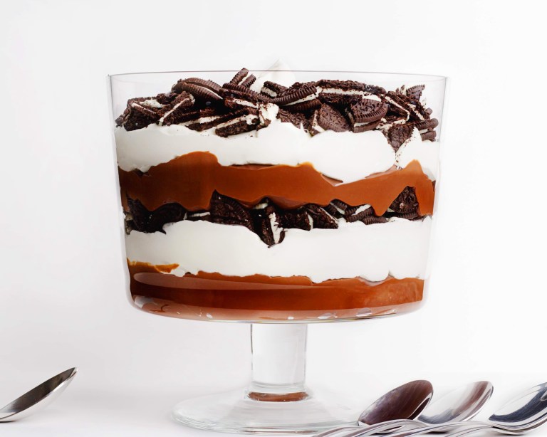In a 3-quart trifle bowl, make 4 layers each of the pudding, whipped cream and crushed cookies. Serve.
