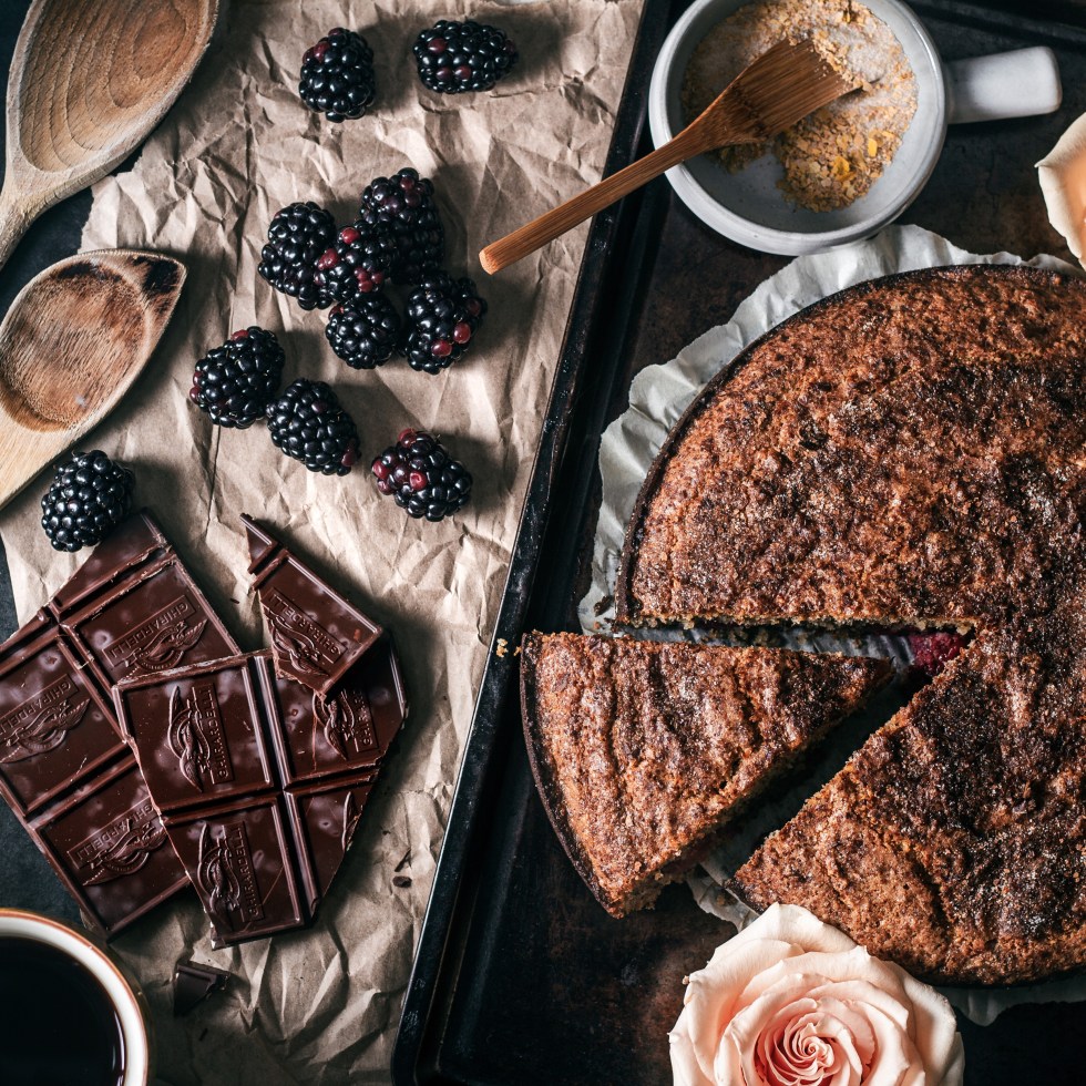 Hazelnut Rye Cake with Rose Sugared Blackberries