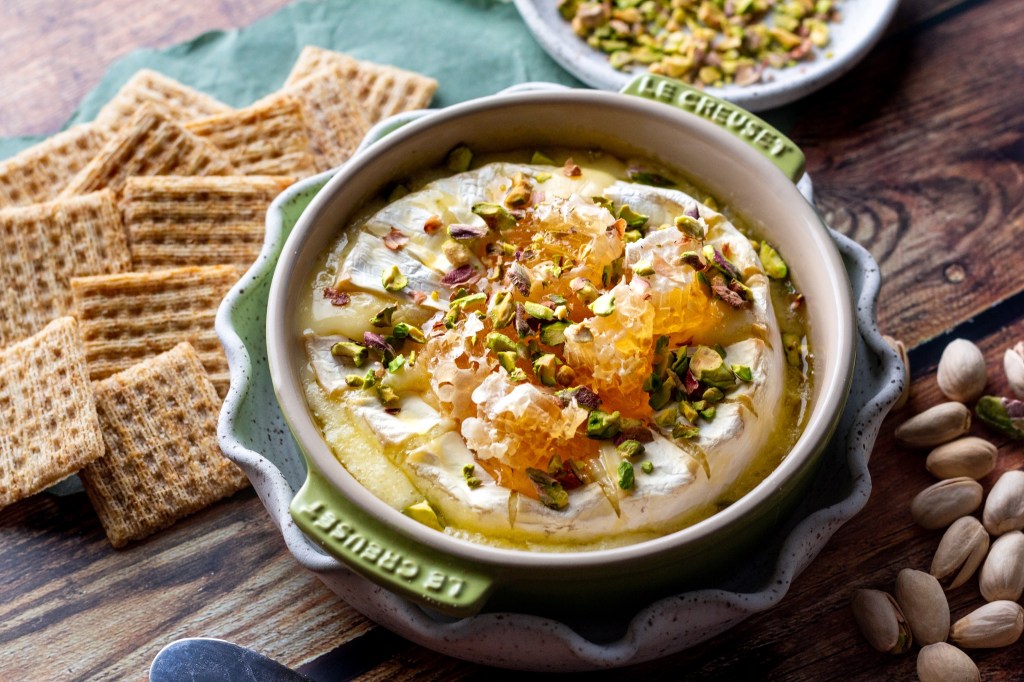 Quick and easy recipe from Smoke, Roots Mountain Harvest Cookbook but it’s basically just baking a wheel of Brie at 350 for 20-30mins and topping it with some chunks of local honeycomb and chopped pistachios.
